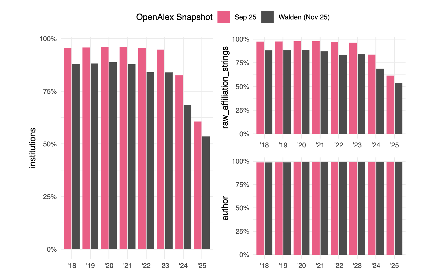 This blog post examines the decrease in affiliation metadata coverage in OpenAlex. An analysis of over 13 million articles published by major commercial publishers between 2018 and 2025 suggests that this is probably because publishers have not provided Crossref with sufficient affiliation metadata. However, technical issues also seem to have occurred during the transition to Walden, the new version of OpenAlex. Elsevier, the largest publisher, stands out in particular.